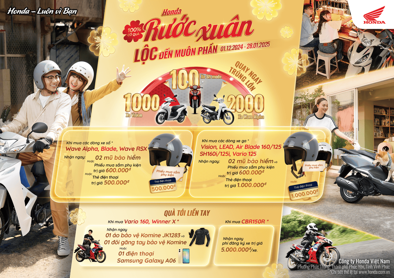 Thời gian: Từ 1/12/2024 đến 28/1/2025.Tết Ất Tỵ này, hãy cùng Honda rinh xe mới, đón lộc đầu năm với chương trình khuyến mại hoành tráng nhất năm! Quý khách sẽ được tham gia vòng quay may mắn để có cơ hội TRÚNG: 100 𝑮𝒊𝒂̉𝒊...