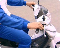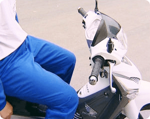- Vị trí ngồi: Dựng chân chống giữa của xe, đứng thẳng lên thanh để chân và từ từ ngồi xuống, động tác này giúp chúng ta ngồi được vào giữa yên xe, không bị lệch sang trái hoặc sang phải, xác định xem có ngồi quá về phía sau hoặc phía trước hay không bằng cách xoay hết tay lái về bên phải và bên trái, nếu thấy khuỷu tay thúc vào mạng sườn thì có nghĩa là chúng ta ngồi quá gần so với cần lái hoặc nếu thấy tay căng thì chúng ta đã ngồi quá xa so với cần lái, cần điều chỉnh lại cho phù hợp.