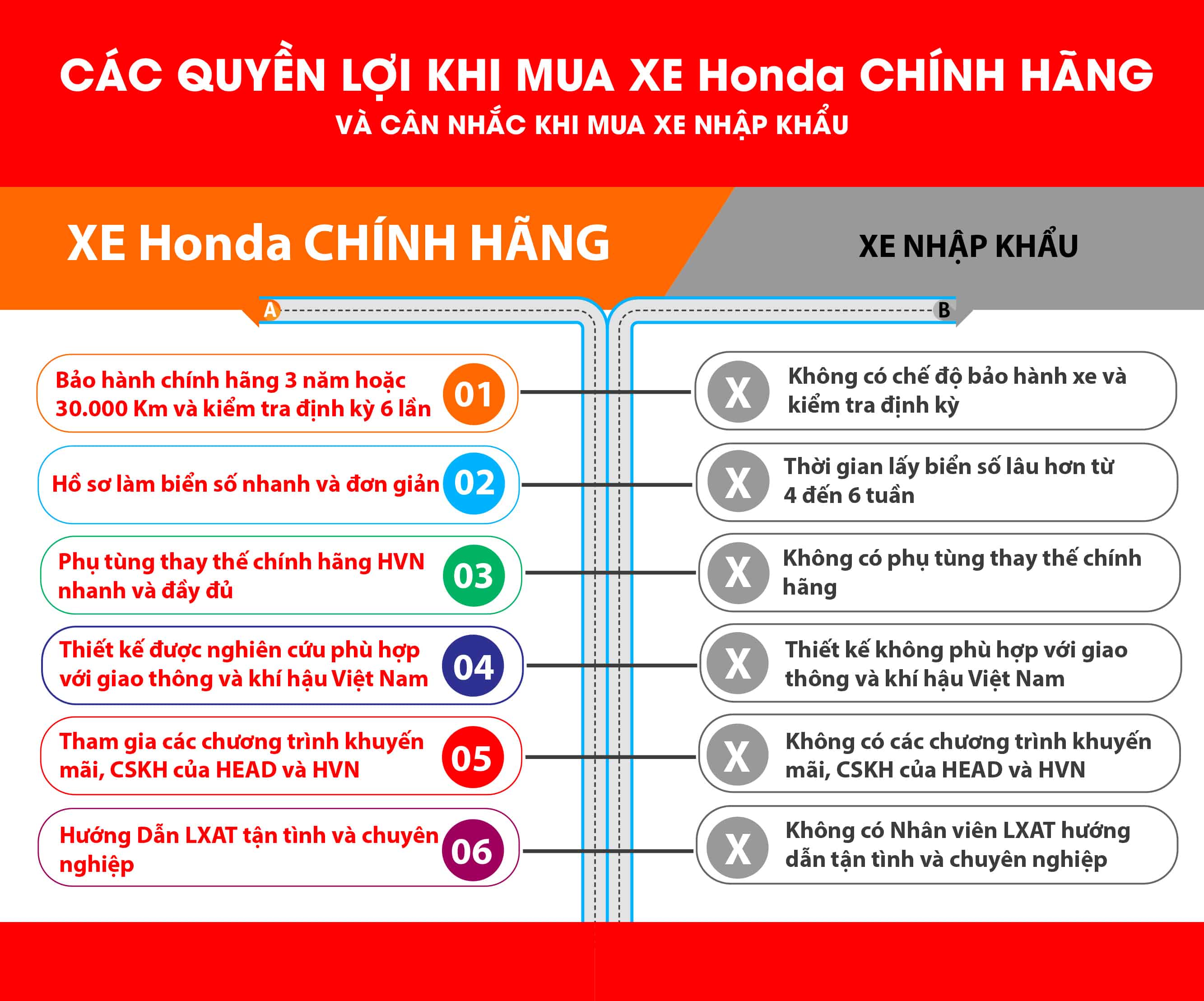 Khi phân phối tại thị trường Việt Nam, Honda đã nghiên cứu và điều chỉnh các thông số kỹ thuật của xe để có thể phù hợp với điều kiện giao thông và khí hậu Việt Nam. Từng thị trường sẽ có các thông số khác nhau. Vì vậy, xe chính hãng luôn có mức độ an toàn và ổn định hơn khi sử dụng tại Việt Nam so với xe nhập khẩu.